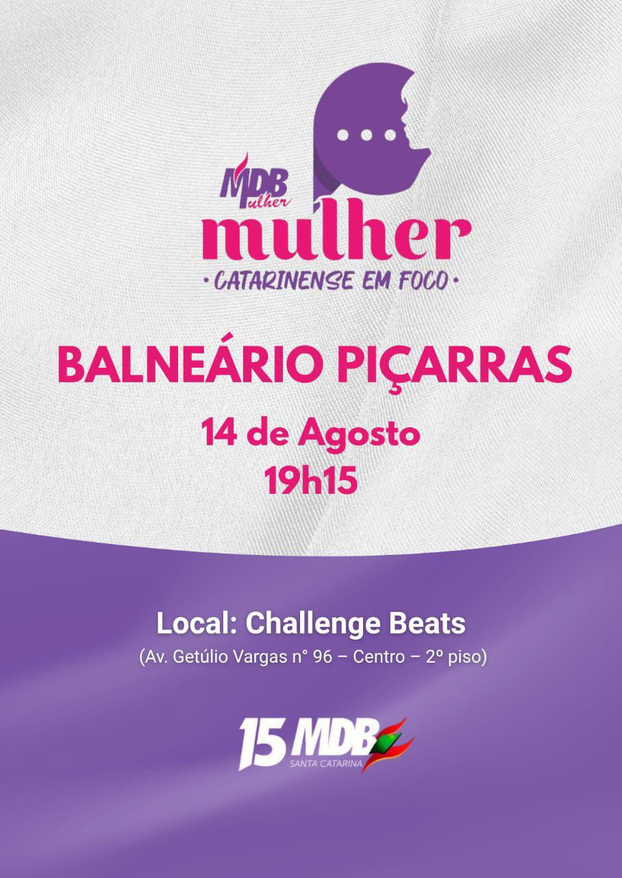 O MDB de Balneário Piçarras está nos preparativos para mais um grande evento: “MDB Mulher em Foco”, programado para o dia 14 de agosto. O evento promete reunir mais de 200 mulheres no Challange Beats, a partir das 19h15, com troca de experiências, fortalecimento da participação feminina na sociedade, reforçando a rede de apoio entre mulheres.