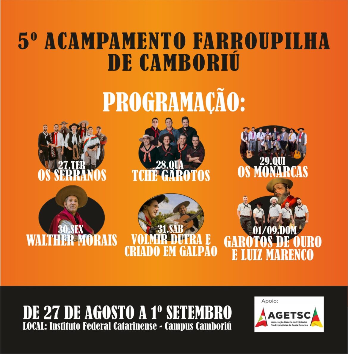 Na contagem regressiva para o início do 5° Acampamento Farroupilha de Camboriú, os preparativos estão a todo o vapor. A festa que será realizada do dia 27 de agosto a 1° de setembro, será no pavilhão que já está montado no Instituto Federal Catarinense (IFC), campus Camboriú, localizado no na Rua Joaquim Garcia, no Centro. A entrada é gratuita. O evento é uma realização da Prefeitura por meio da Fundação Cultural com apoio da Secretaria de Obras e da Associação Gaúcha de Entidades Tradicionalistas de Santa Catarina (AGETSC). Além disso, nesse domingo, dia 25, será realizada a tradicional cavalgada com a Chama Crioula. A concentração será às 9h no CTG Estância Caledônia, em frente ao Condomínio Caledônia, localizado na Rua Ivo José Rebelo.