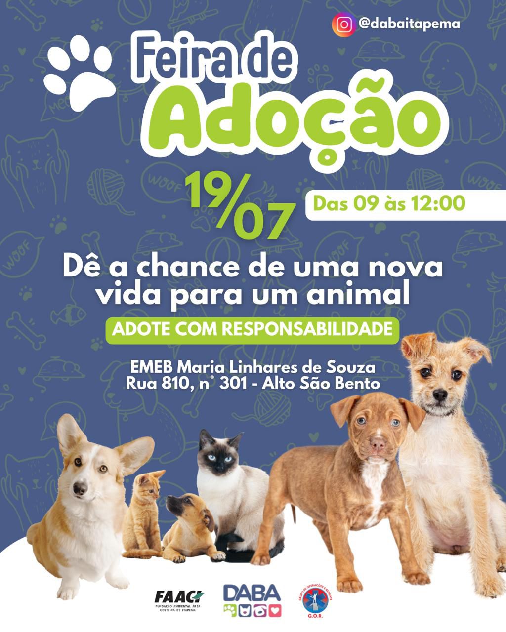 Quem quer adotar um novo amigo de quatro patas terá a oportunidade neste sábado (19/07), durante a Feira de Adoção realizada na EMEB Maria Linhares de Souza (Rua 810, nº 301 – Alto São Bento), das 9h às 12h. A ação faz parte da programação do evento Cidadania Perto de Você.