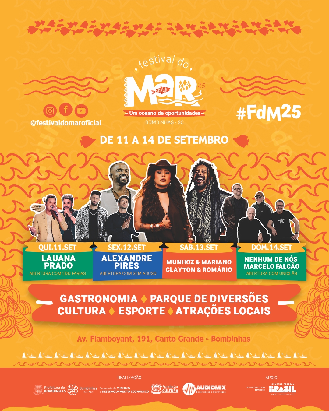 Bombinhas se prepara para viver dias de muita alegria e celebração. Com o tema “Um oceano de oportunidades”, o terceiro Festival do Mar será realizado de 11 a 14 de setembro, reunindo em um só evento música, gastronomia, arte e lazer para toda a família. Considerada a maior festa do calendário municipal, a programação conta com shows nacionais, competições tradicionais e manifestações culturais que reforçam a identidade local.