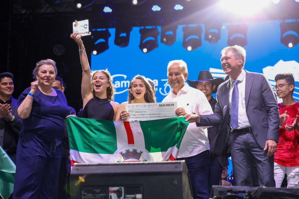 O Trapiche da Beira-Mar Norte, em Florianópolis, foi palco da grande final do Santa Catarina Canta – Festival Sertanejo neste domingo, 10, com cerca de 38 mil pessoas. Após percorrer 21 cidades das seis regiões do Estado, o festival chegou ao fim com o anúncio dos vencedores: Weslen Bachega (Vale do Itajaí) foi 1º lugar na categoria geral e a dupla Kyara e Thaís (Oeste) levou o 1º lugar na infantojuvenil. Os ganhadores de cada categoria receberam o prêmio das mãos do governador Jorginho Mello, que acompanhou a noite de decisão. Além dos R$20 mil pela conquista, os talentos revelados poderão participar do espetáculo sertanejo da Camerata na temporada 2024/2025.