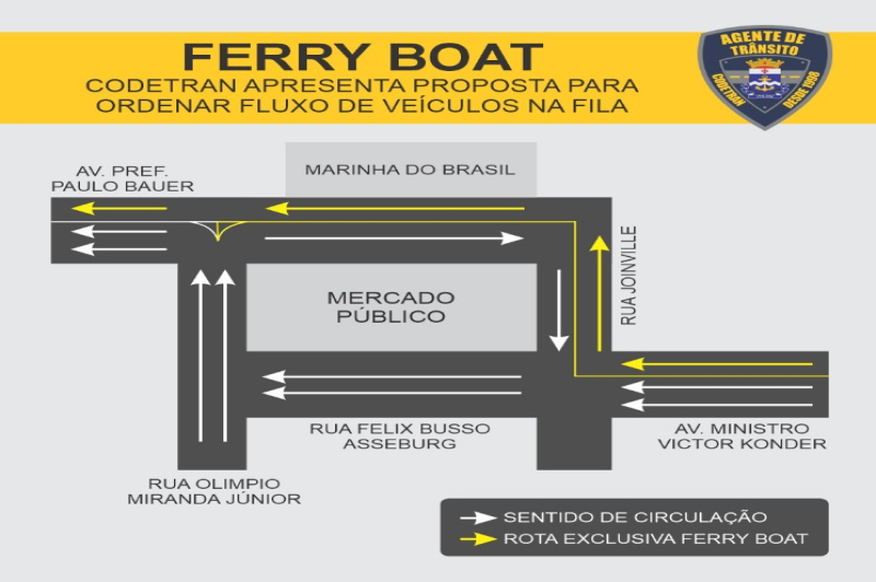 Já as vagas da rua Joinville serão removidas para viabilizar a passagem da nova fila para o Ferry Boat. Atualmente, a rua Joinville e a avenida Prefeito Paulo Bauer possuem sentido único (em direção à Drogaria Catarinense), passarão a ter sentido duplo com a formação da fila para o Ferry Boat. É importante destacar que a faixa será exclusiva para a utilização dos veículos que utilizarão a travessia pelas balsas.