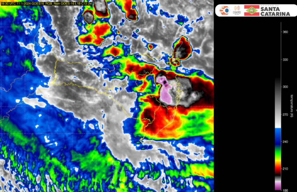 Figura 2. Imagem de satélite GOES-16, canal infravermelho realçado, às 16h30 (horário local). Fonte: Defesa Civil de Santa Catarina.