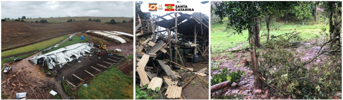 Foto: Da esquerda para a direita: destruição de um barracão (2 primeiras imagens) e queda de árvores no interior de Abelardo Luz. Fonte: Defesa Civil municipal.