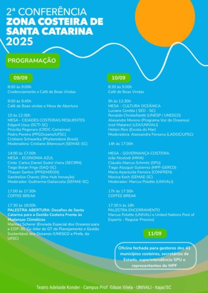 O evento acontecerá na Univali, no Teatro Adelaide Konder, localizado no Campus Professor Edison Villela (Itajaí). As inscrições são gratuitas e abrem nos próximos dias pelo site https://www.semae.sc.gov.br/2a-conferencia-zona-costeira-de-santa-catarina.