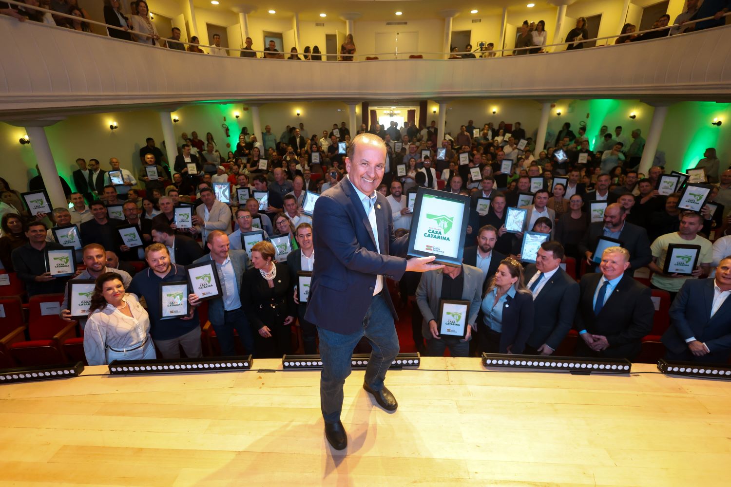 O governador Jorginho Mello e a vice-governadora Marilisa Boehm anunciaram nesta terça-feira, 27, os 106 municípios de até 10 mil habitantes beneficiados na primeira etapa do Programa Casa Catarina. No evento, realizado no Teatro Álvaro de Carvalho (TAC), no Centro de Florianópolis ele também anunciou a ampliação do programa para todos os municípios do estado.