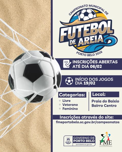 O Governo de Porto Belo, por meio da Fundação Municipal de Esportes (FME), está com inscrições abertas para o Campeonato Municipal de Futebol de Areia 2026. A competição será realizada na Praia do Baixio, no bairro Centro, e promete movimentar o esporte e o lazer no município durante a temporada de verão.