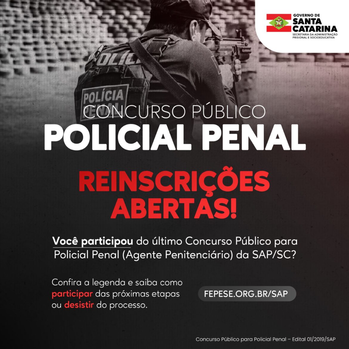 O Governo do Estado, por meio da Secretaria de Administração Prisional e Socioeducativa de Santa Catarina (SAP/SC) reativou o Concurso Público para Policial Penal (anteriormente Agente Penitenciário), originalmente iniciado em 2019. Os candidatos convocados têm até 27 de setembro para efetuar a reinscrição ou formalizar a desistência no certame.