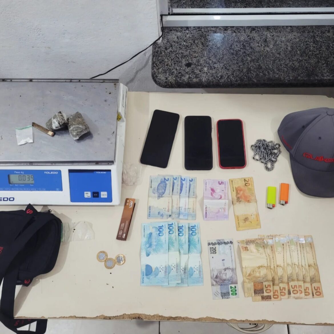 Ao chegar no local, a equipe encontrou um homem com as características descritas na denúncia, identificado como N. P. S., o qual estava em posse de 38 (trinta e oito) gramas de substância análoga a maconha, 1 (uma) grama de substância análoga à cocaína, 3 (três) celulares, sendo um iPhone 13 que estava bloqueado, bem como R$986,00 (novecentos e oitenta e seis) reais em dinheiro.