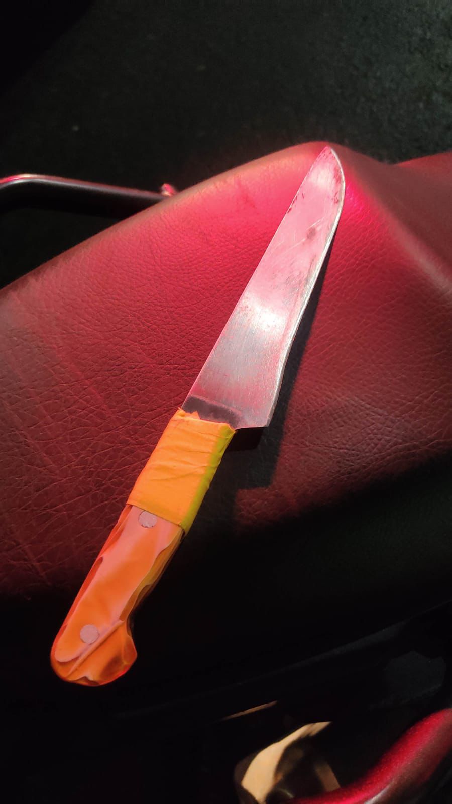A equipe do Canil e do GRR se deslocou até o local e encontrou o suspeito na lateral do supermercado. Durante a abordagem, os agentes localizaram uma faca de cozinha presa à cintura do homem e um canivete em seu bolso traseiro. Ao ser questionado sobre os objetos, ele não soube justificar sua posse e apresentou discurso incoerente.