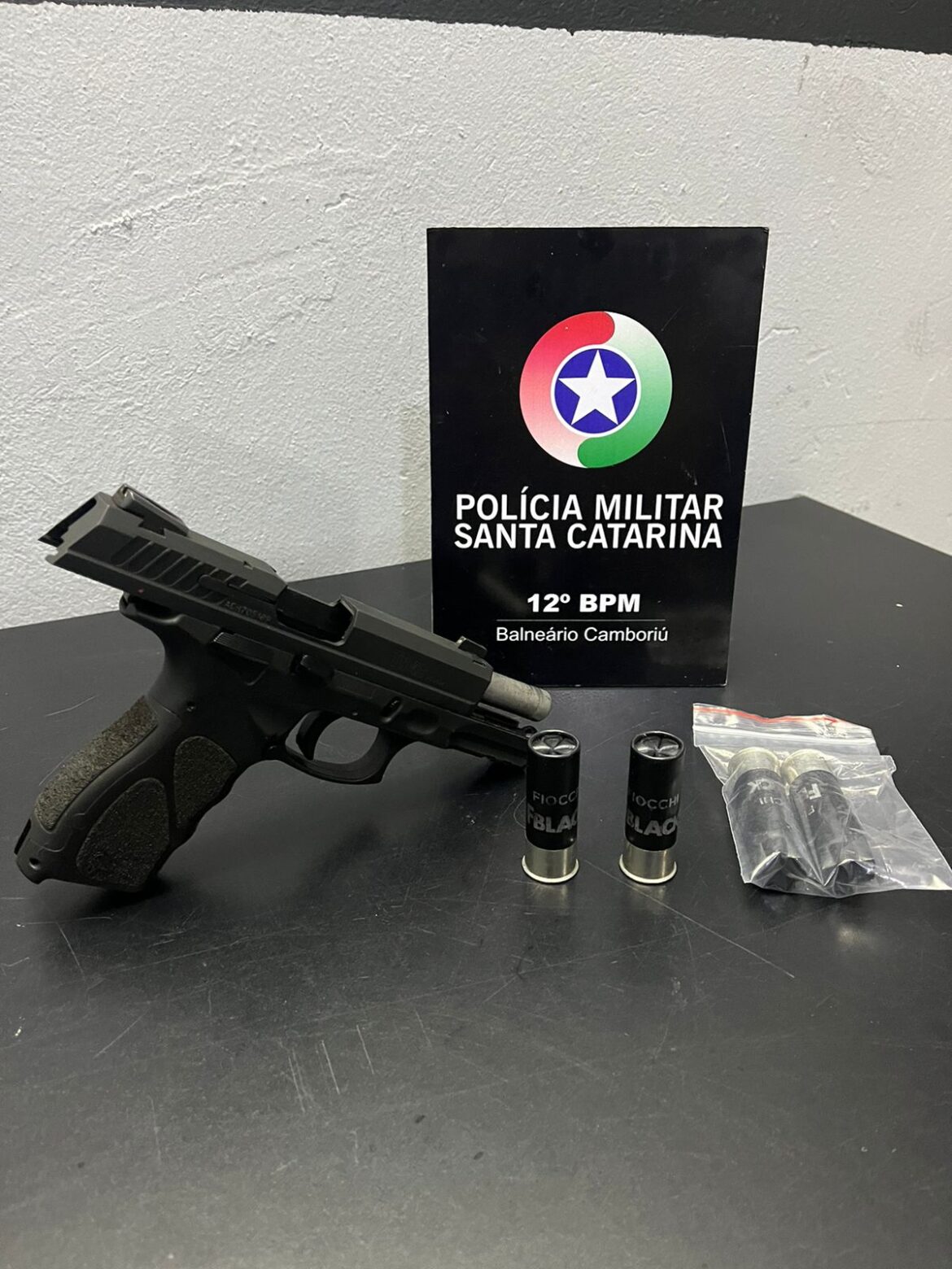 Após serem separados por terceiros, o autor se evadiu do local. A guarnição foi até o terreno de propriedade do autor, sendo o mesmo localizado no interior da residência, bem como uma pistola, e quatro munições de calibre 12 , duas ja deflagradas.