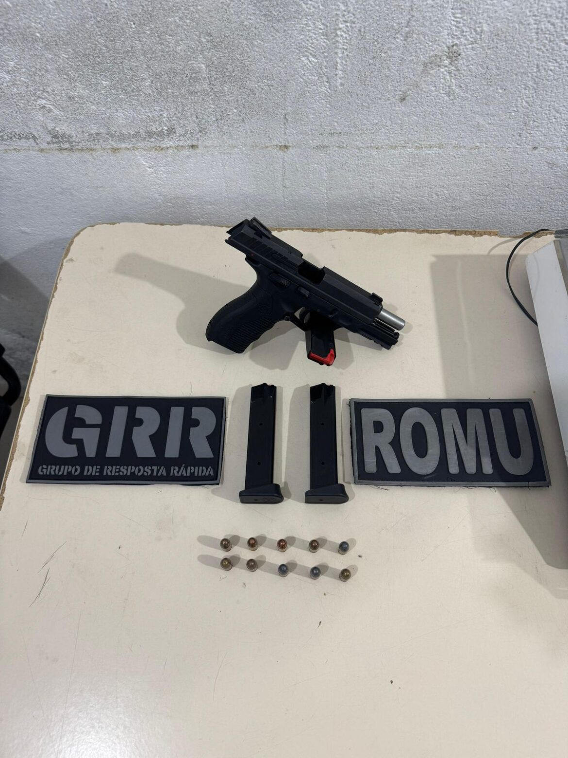 Durante a abordagem, os agentes encontraram uma pistola calibre .380 e três carregadores, sendo um municiado. Em consulta, verificou-se que a arma havia sido furtada em um estabelecimento na cidade de Maringá/PR.