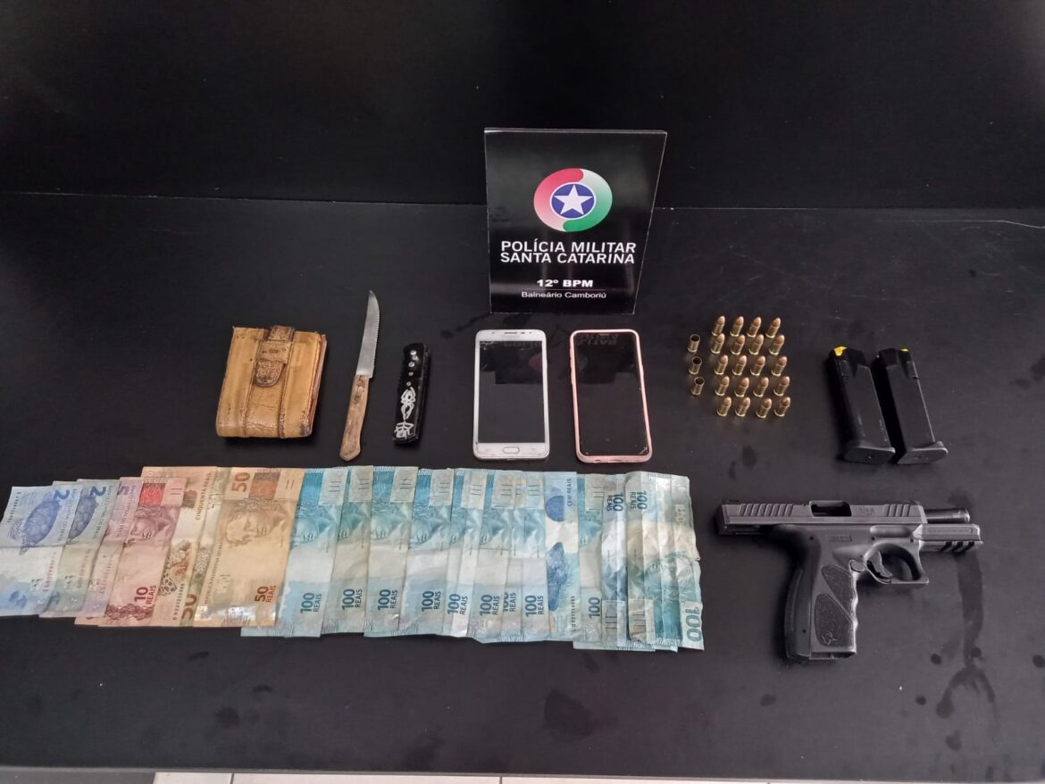 O passageiro, de 23 anos, desceu do automóvel, enquanto o condutor, de 36 anos, permaneceu por alguns instantes no interior, tentando esconder algum objeto. Em revista pessoal aos suspeitos, nada de ilícito foi encontrado. Contudo, em busca veicular, foi encontrada uma pistola, três cápsulas deflagradas, um carregador sobressalente e R$ 1.669,00 reais em espécie.