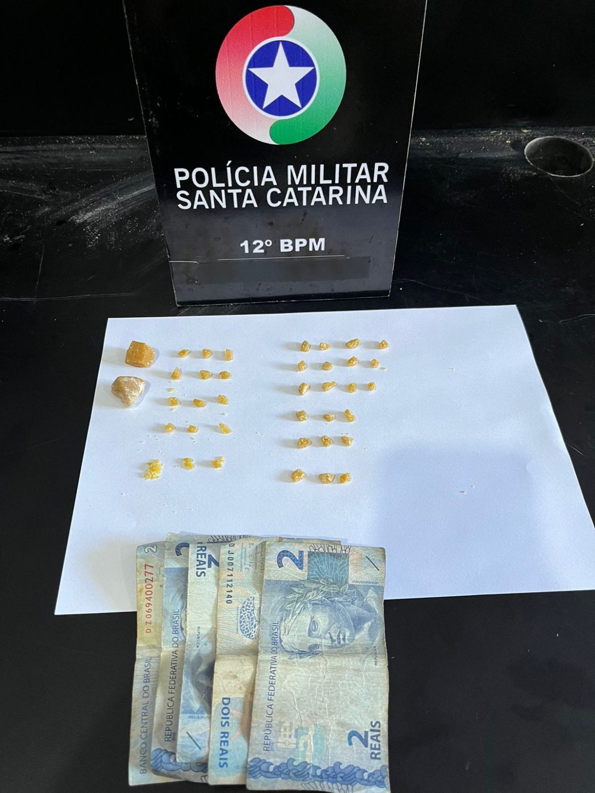 A guarnição conseguiu realizar a abordagem do masculino de 22 anos sem camiseta e boné preto, que em revista pessoal foi localizado no bolso da bermuda jeans a quantia de 10 reais(5 notas de 2 reais), e ao verificar os objetos arremessados, se tratavam de uma pedra maior de Crack pesando 3g, e no invólucro branco uma pedra maior e 15 menores pesando 4g, totalizando 7g.