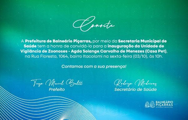 A Prefeitura de Balneário Piçarras, por meio da Secretaria de Saúde, reforça o evento de inauguração da Unidade de Zoonoses (Casa Pet) nesta sexta-feira (03/10), às 10h. É um serviço de saúde pública dedicado à prevenção, controle e orientação sobre doenças transmitidas entre animais e pessoas, promovendo saúde, bem-estar e qualidade de vida para toda a comunidade.