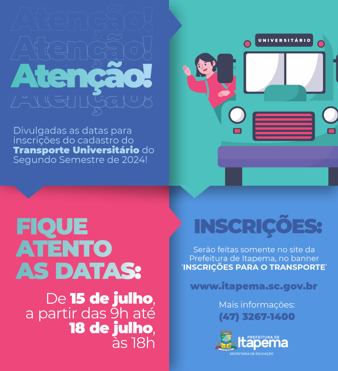 A Secretaria de Educação informa que as inscrições para o transporte universitário do segundo semestre de 2024 abrem no dia 15 de julho partir das 9h e seguem até 18 de julho, às 18h diretamente no site da Prefeitura de Itapema (www.itapema.sc.gov.br). O edital completo também está disponível no site da Prefeitura de Itapema (www.itapema.sc.gov.br) na aba Serviços – Cidadão – Edital do Transporte Universitário. Mais informações pelo telefone (47) 3267-1400.