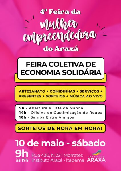 A 4ª Edição da Feira da Mulher Empreendedora do Instituto Araxá já tem data para acontecer. O evento está marcado para o próximo sábado, 10, das 9h às 17h. A feira conta com 15 expositoras, sorteios de hora em hora, música ao vivo com o Samba Entre Amigos e serviços gratuitos. Promovida pelo Instituto Araxá, a Feira acontece na sede da instituição, na rua 430, nº 22, bairro Morretes.