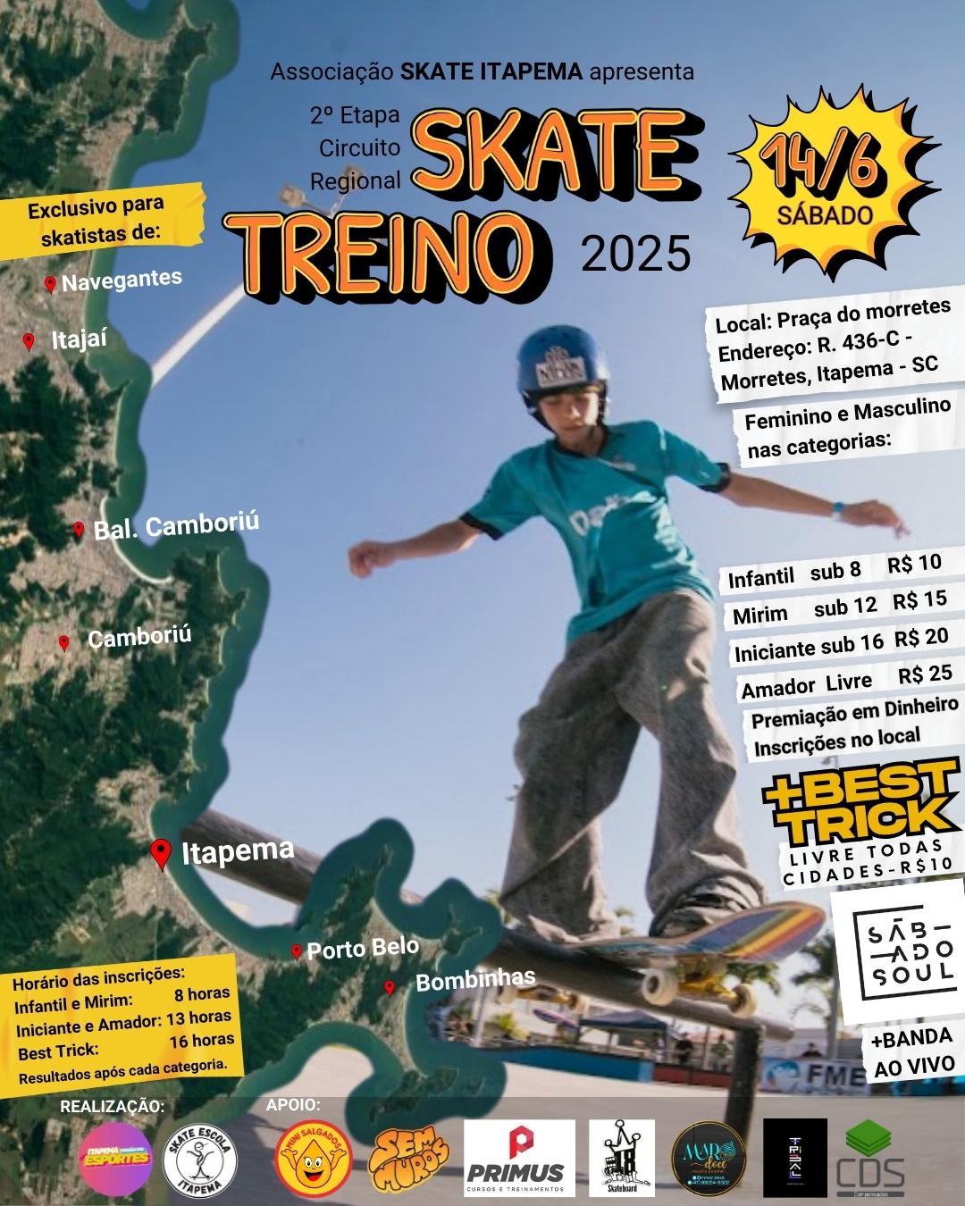 A Praça do Morretes, em Itapema, será palco da 2ª Etapa do Circuito Regional Skate Treino neste sábado (14/06). O evento é promovido pela Associação Skate Itapema e será exclusivo para skatistas das cidades de Itapema, Porto Belo, Bombinhas, Camboriú, Balneário Camboriú, Itajaí e Navegantes.
