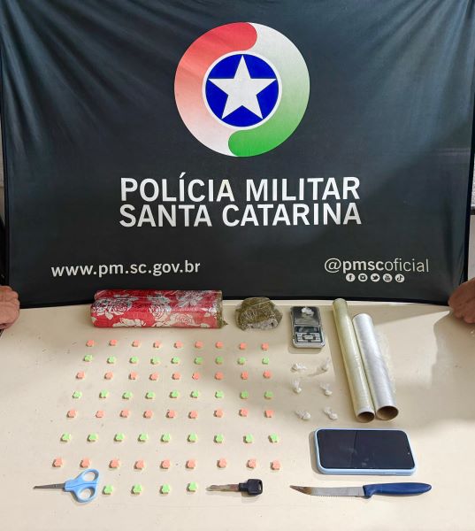 Durante a revista, os policiais localizaram na mochila dispensada 67 comprimidos de ecstasy. Já na pochete que o suspeito utilizava na cintura, foram encontradas nove buchas de cocaína e um aparelho celular.