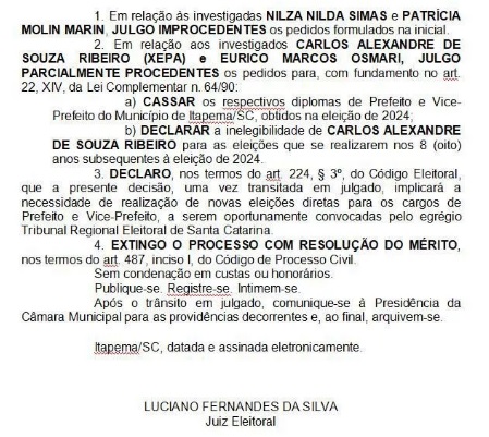 A decisão, assinada pelo juiz Luciano Fernandes da Silva, determina a perda dos diplomas obtidos nas eleições municipais de 2024. O magistrado também determinou que, após o trânsito em julgado da sentença, sejam convocadas novas eleições diretas em Itapema. Com a cassação, Xepa está impedido de se candidatar por oito anos, contados a partir do pleito de 2024.