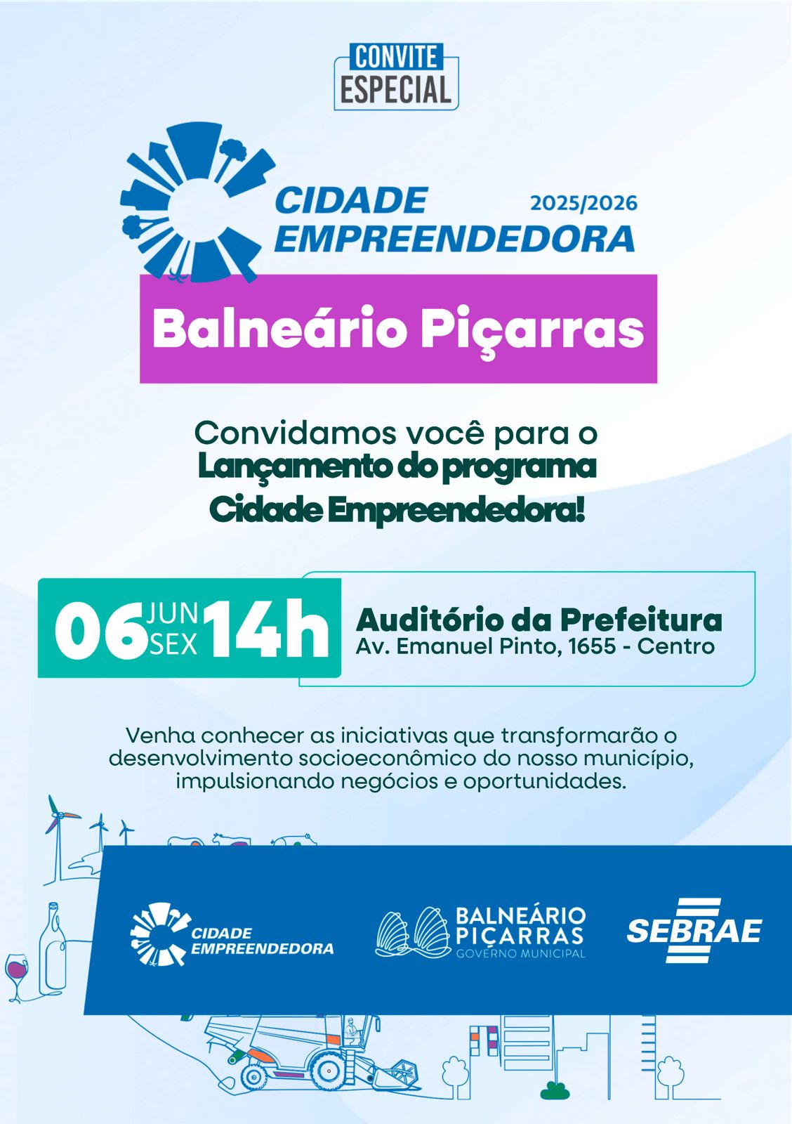 A Prefeitura de Balneário Piçarras, em parceria com o Sebrae/SC, realiza nesta sexta-feira (06/06), às 14h, o lançamento do Programa Cidade Empreendedora. O evento será no auditório da Prefeitura (Av. Emanuel Pinto, 1655 – Centro), com a presença do Prefeito, lideranças locais e representantes do Sebrae.