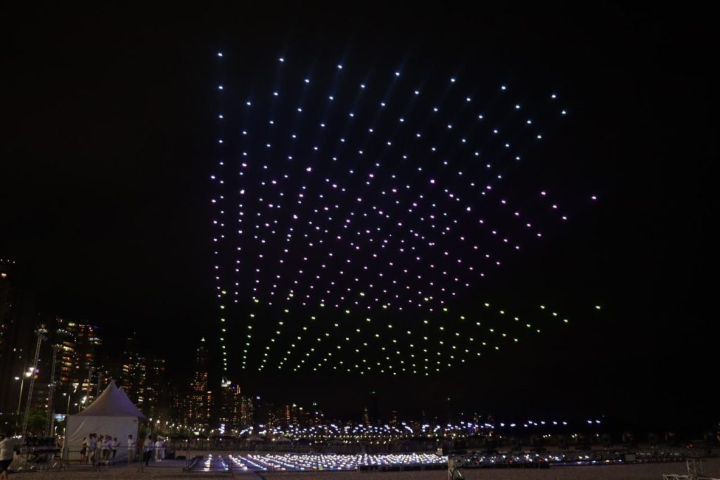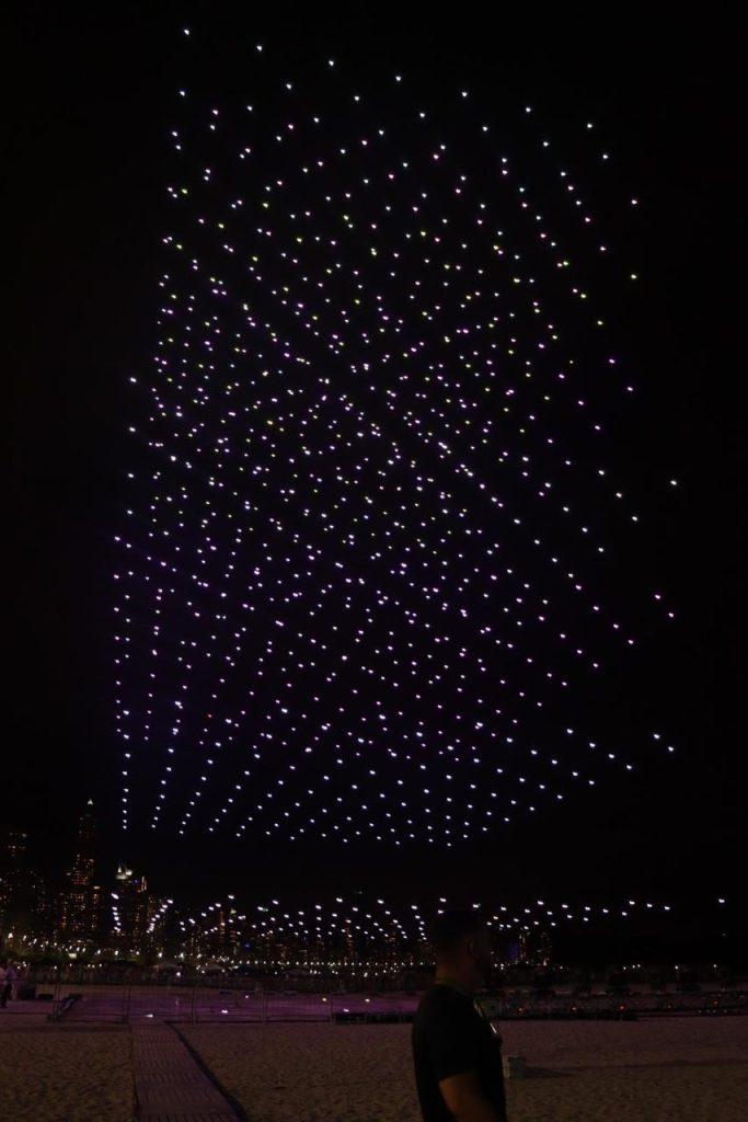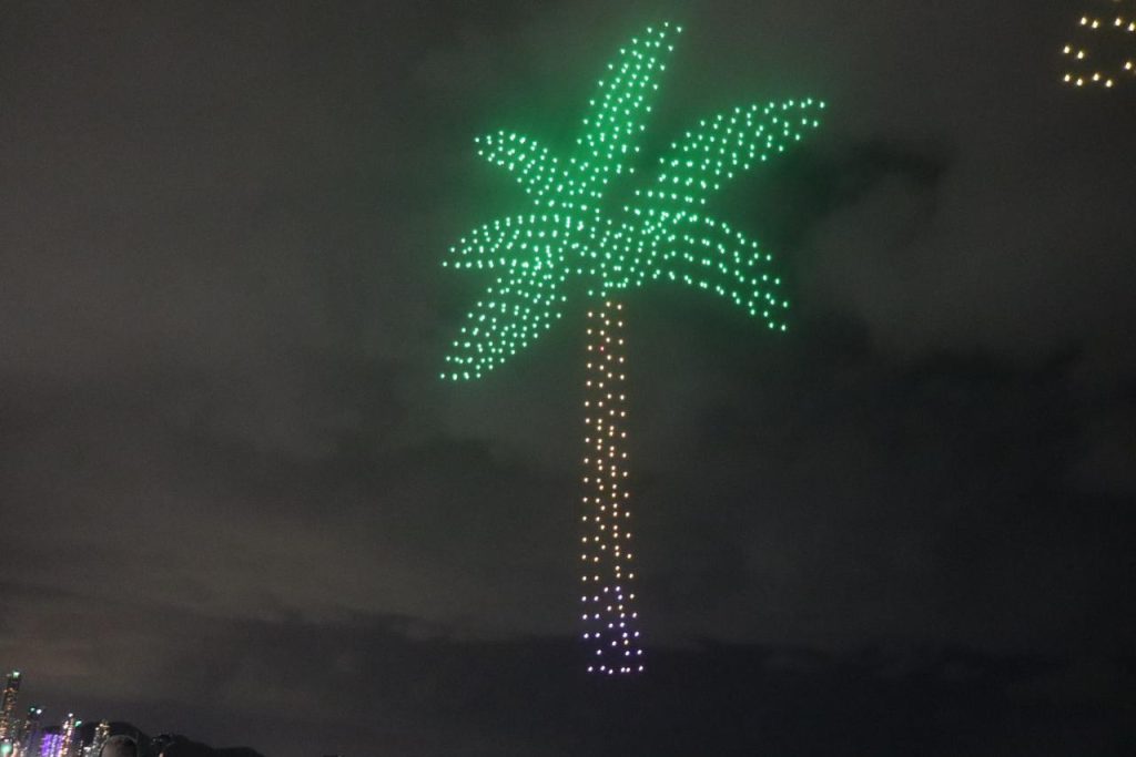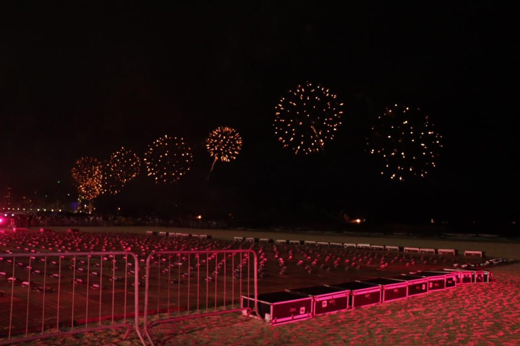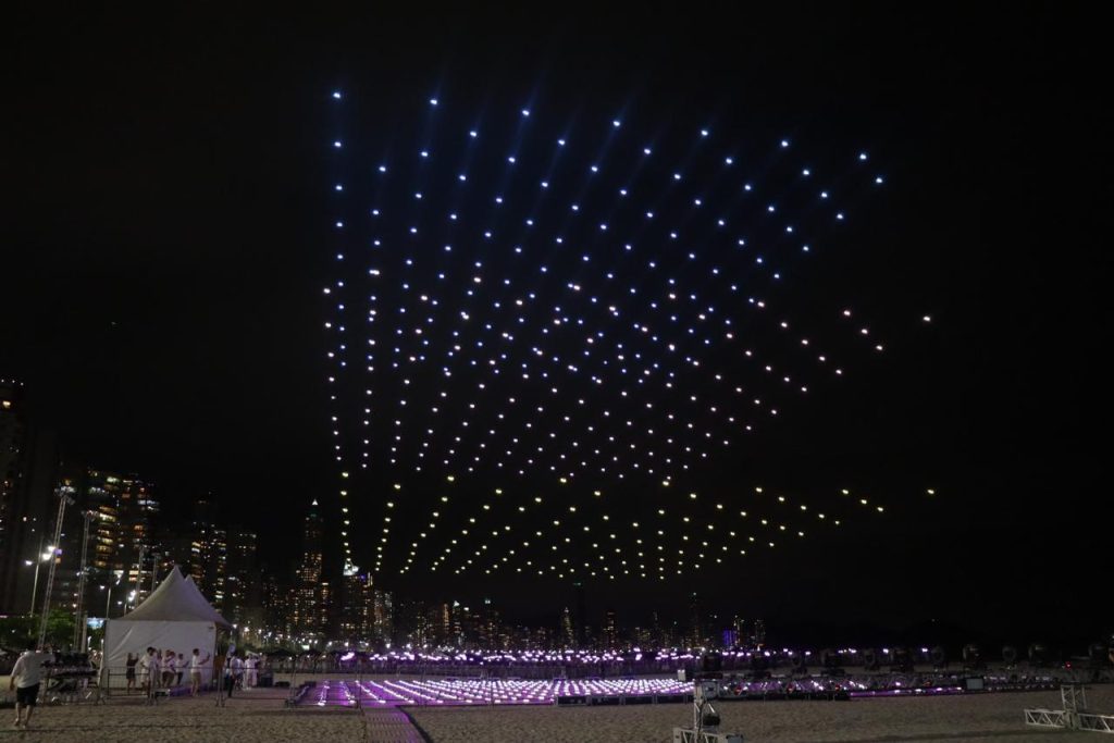 Presente do governo da capital dos Emirados Árabes, Abu Dhabi, a maior apresentação de drones já registrada na América Latina reuniu mil aparelhos na Barra Sul, desenhando no céu figuras como a Ilha das Cabras e mensagens de Ano Novo. Findada a apresentação, foi a vez dos fogos se tornarem a estrela principal da noite. Após contagem regressiva feita na roda gigante do Pontal Norte, um espetáculo pirotécnico de 15 minutos iluminou a cidade.