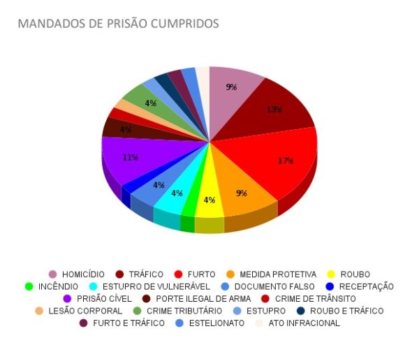 Ao todo, foram cumpridos 46 mandados de prisão no período, o que representa uma média de 7,6 por mês. Desses, 17% foram relacionados ao crime de furto, 13% ao tráfico de entorpecentes, 9% a homicídios e 4% ao crime de estupro de vulnerável.