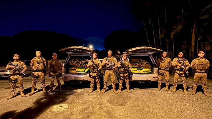 Na SC-418, os militares visualizaram os dois veículos suspeitos retornando em direção à BR-101. Um deles foi abordado e seus ocupantes, um homem de 24 anos, uma mulher de 25 e um homem de 20, apresentaram informações contraditórias sobre a origem e o destino da viagem. Diante da confirmação de que estavam em comboio, admitiram que haviam sido contratados por um desconhecido para buscar uma pessoa e uma “carga” na região de Pirabeiraba, alegando desconhecer o conteúdo transportado.