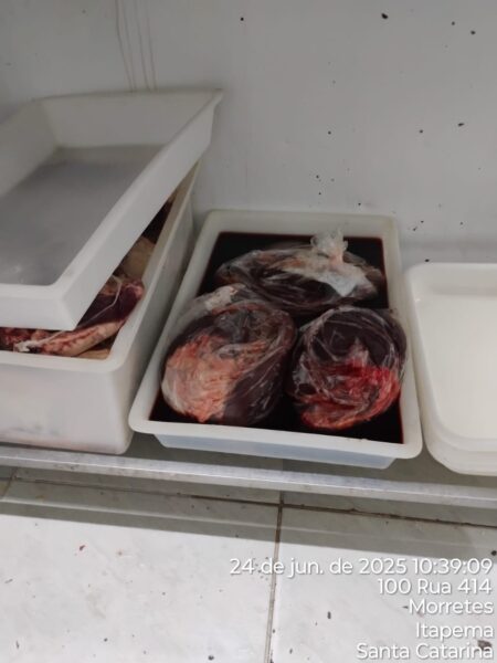 Uma força-tarefa coordenada pelo Ministério Público de Santa Catarina (MPSC) resultou na apreensão de 623 quilos de carne imprópria para o consumo humano em Itapema. A ação ocorreu na terça-feira (24/6) e integra o Programa de Proteção Jurídico-Sanitária dos Consumidores de Produtos de Origem Animal (POA), que tem como objetivo proteger a saúde dos consumidores e combater práticas irregulares no comércio de alimentos.