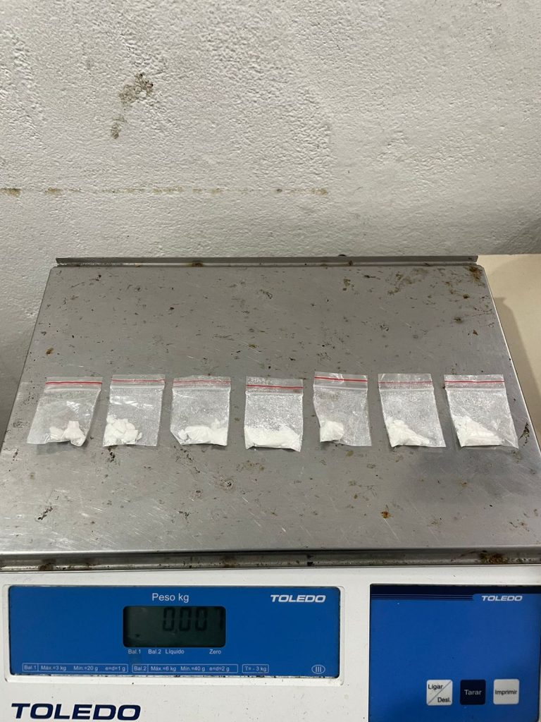 No momento da abordagem, foi possível visualizar o masculino tentando dispensar uma sacola de cor amarela, onde foram encontradas 7 frações de substância análoga à cocaína, já embaladas e fracionadas para a venda, pesando aproximadamente 7 gramas.