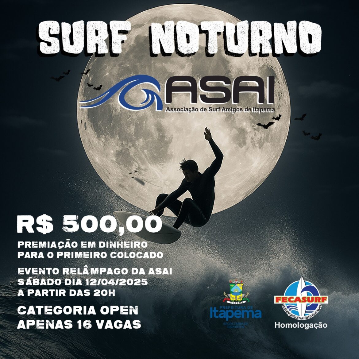 O Molhe da Praia Central será o cenário de uma competição relâmpago: o Surf Noturno. O evento acontece neste sábado, 12 de abril, a partir das 20h, e é promovido pela Associação de Surf Amador de Itapema (ASAI), com apoio da Secretaria de Esporte de Itapema.