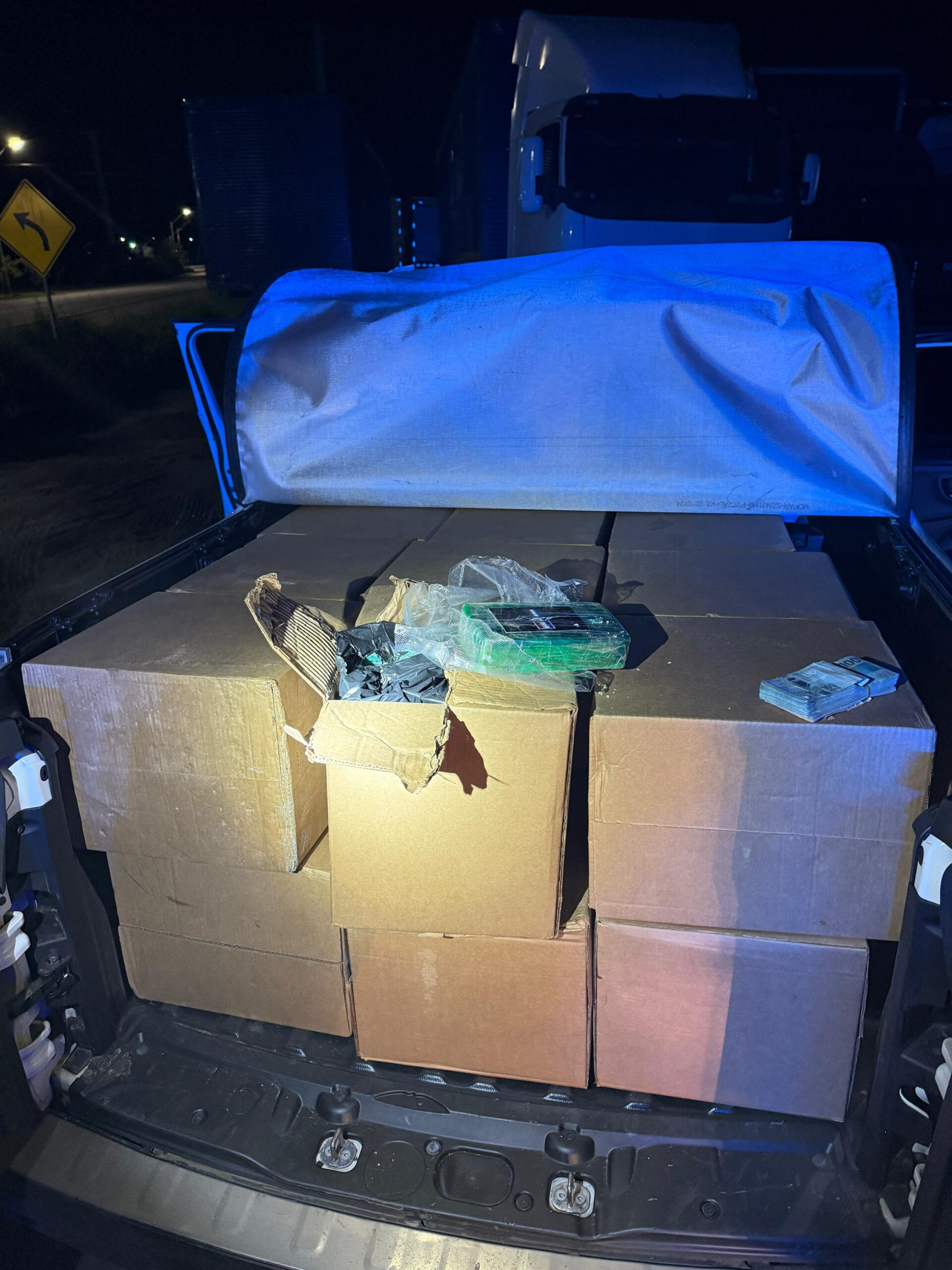 Na caçamba da caminhonete, os agentes encontraram diversas caixas de papelão, contendo centenas de tabletes cuidadosamente embalados. Ao todo, 429 kg de cocaína, que haviam saído do Paraguai e seriam levados, segundo os criminosos, até Criciúma (SC).
