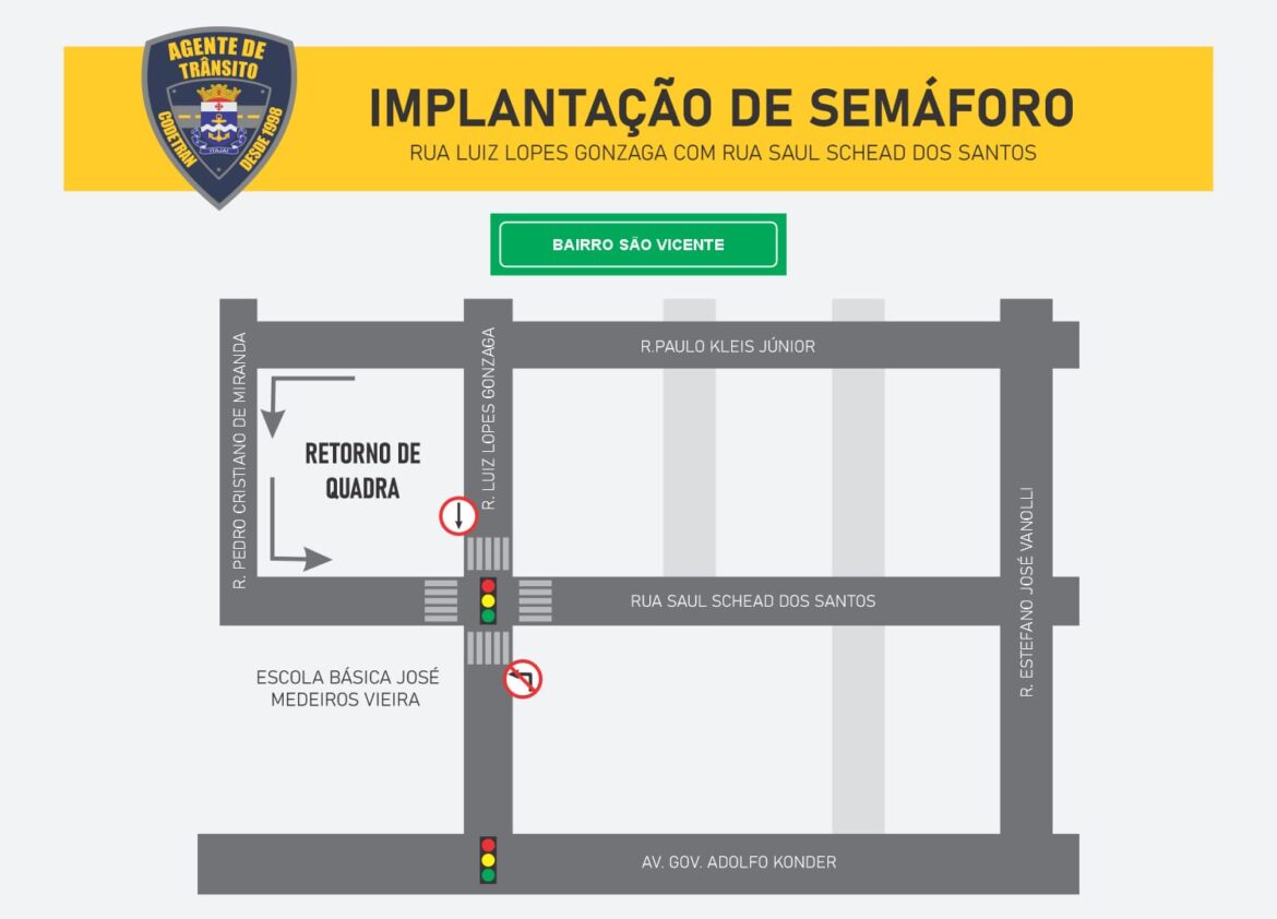 A partir desta segunda-feira (16) o novo semáforo no cruzamento das ruas Luiz Lopes Gonzaga e Saul Schead dos Santos, no bairro São Vicente, entrará em operação. A iniciativa tem como objetivo principal aumentar a segurança dos alunos da Escola Básica José Medeiros Vieira e de toda comunidade durante a travessia, além de melhorar a organização do tráfego em um ponto crítico da cidade.