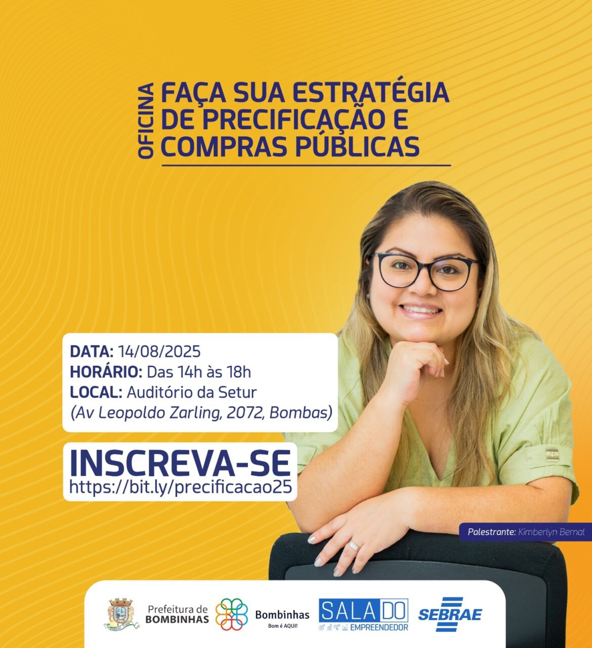 A Sala do Empreendedor de Bombinhas, em parceria com o Sebrae/SC, está com inscrições abertas para a oficina “Faça sua estratégia de precificação e compras públicas”, que será realizada no dia 14 de agosto (quinta-feira), das 14h às 18h, no auditório da Secretaria de Turismo e Desenvolvimento Econômico (Setur). As vagas são limitadas e as inscrições gratuitas podem ser feitas pelo link: bit.ly/precificacao25.