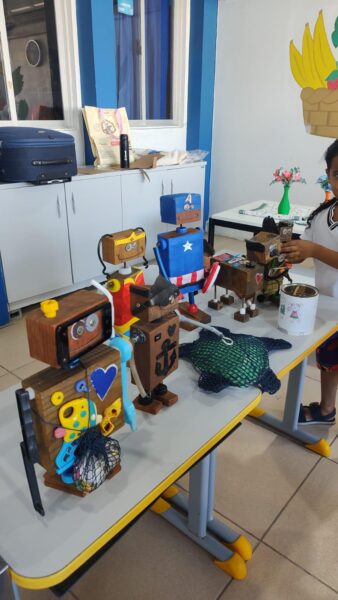 A proposta é despertar desde cedo o interesse pela educação ambiental, de forma lúdica e criativa. Ao longo da oficina, os pequenos são incentivados a cortar, montar e customizar seus robôs, aprendendo na prática a importância do reaproveitamento de resíduos e do cuidado com o planeta. Ao final de cada encontro, as produções são expostas em uma mostra interna na própria unidade escolar.