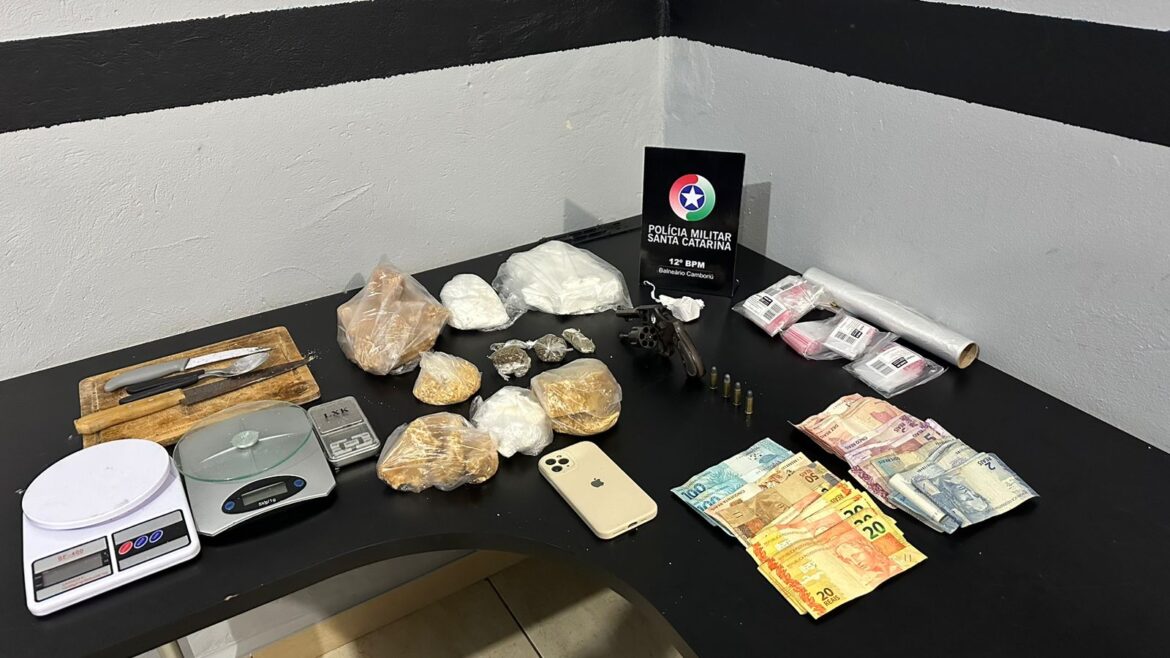 Já na residência do suspeito, na Rua Rufino Olégario, foram encontradas mais 786g de crack, 760g de cocaína e 25g de maconha, bem como 3 balanças de precisão, diversas embalagens plásticas para comercialização, faca com resquícios de entorpecente e 765,00 reais em espécie, além de um revólver, calibre .32, e quatro munições.