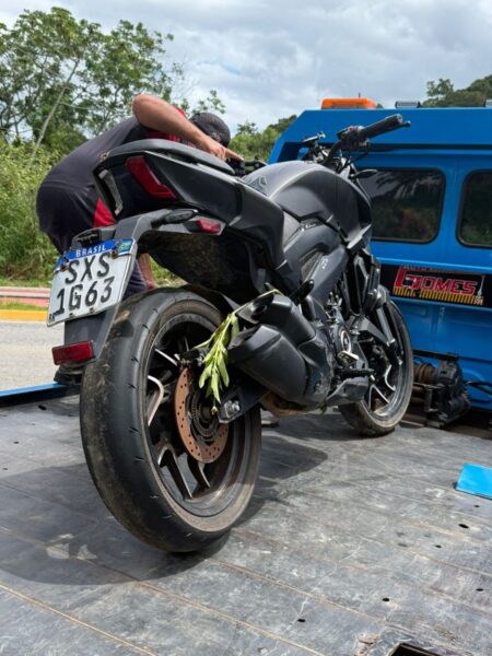 Ainda no decorrer da Operação Lei e Ordem, os policiais localizaram uma motocicleta BAJAJ/DOMINAR D400 escondida em uma área de mata nas proximidades da Avenida João Acácio Simas Cassinho, no bairro Conde Vila Verde. Após consulta aos sistemas, foi confirmado que o veículo possuía registro de furto, sendo removido e encaminhado para os procedimentos legais.