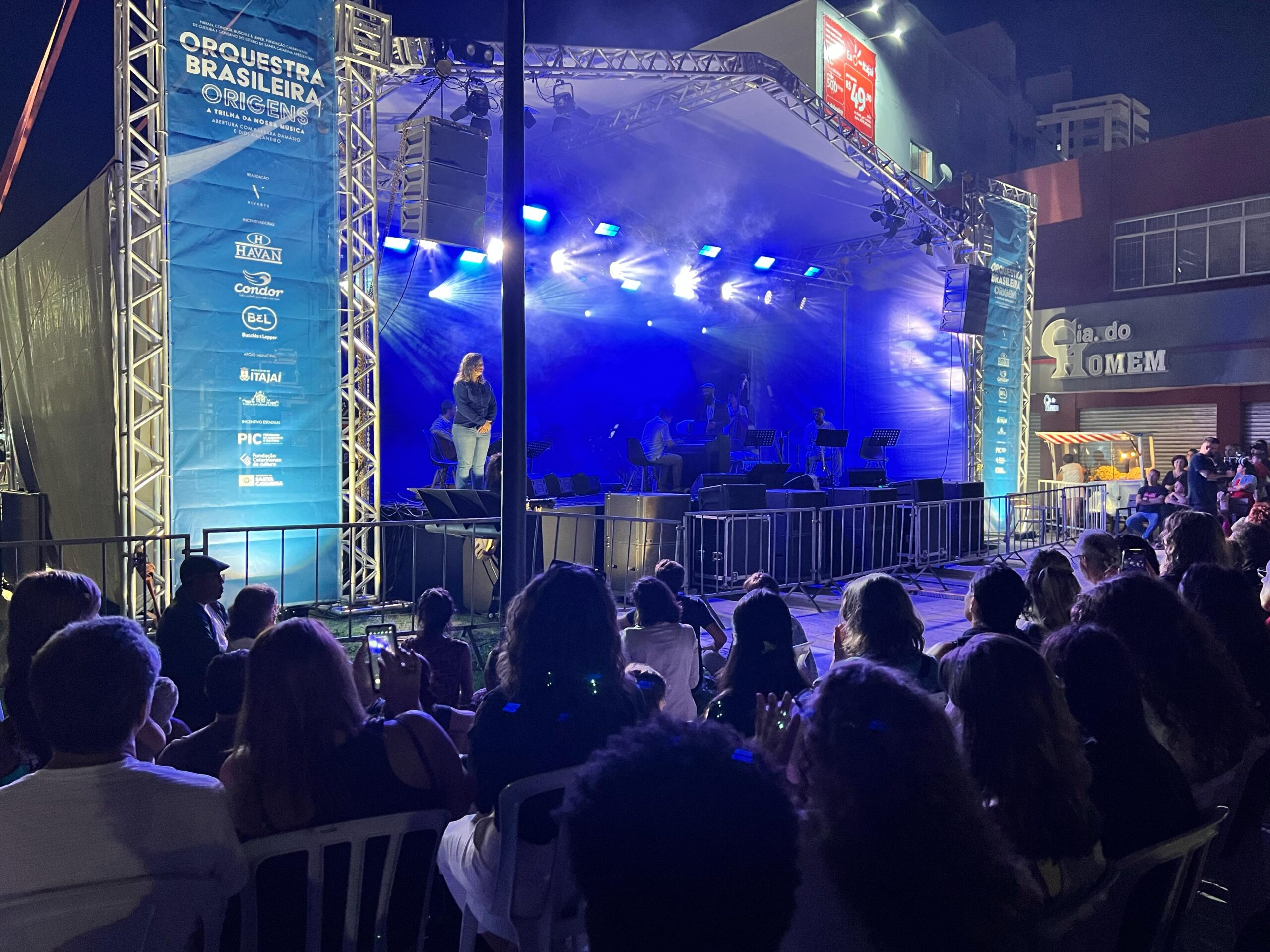 Na noite deste sábado (26), o centro de Itajaí se transformou em um grande palco ao ar livre para receber a apresentação da Orquestra Brasileira Origens. O evento gratuito reuniu cerca de 3 mil pessoas na rua Hercílio Luz, em frente ao Museu Histórico de Itajaí, e foi um verdadeiro espetáculo de música, luzes e imagens.