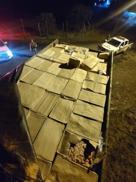 Dentro do caminhão, foram encontradas cerca de sete toneladas de camarão de origem estrangeira e aproximadamente 50 mil carteiras de cigarros contrabandeados. A carga e o veículo foram encaminhados à Receita Federal, enquanto o homem preso foi levado à Delegacia da Polícia Federal em Dionísio Cerqueira, onde foi autuado pelos crimes de contrabando, desobediência e resistência à prisão.