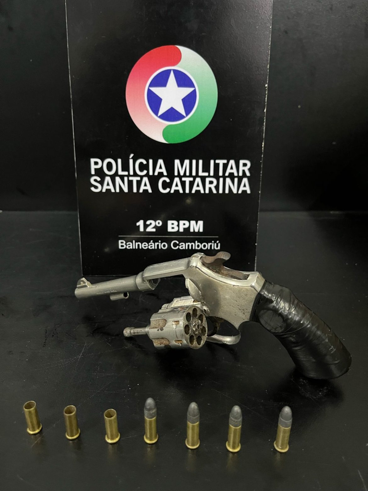 Em revista pessoal, foi localizado um revólver, com 4 munições intactas e 3 deflagradas, além de R$18 e um perfume anteriormente subtraídos da farmácia.