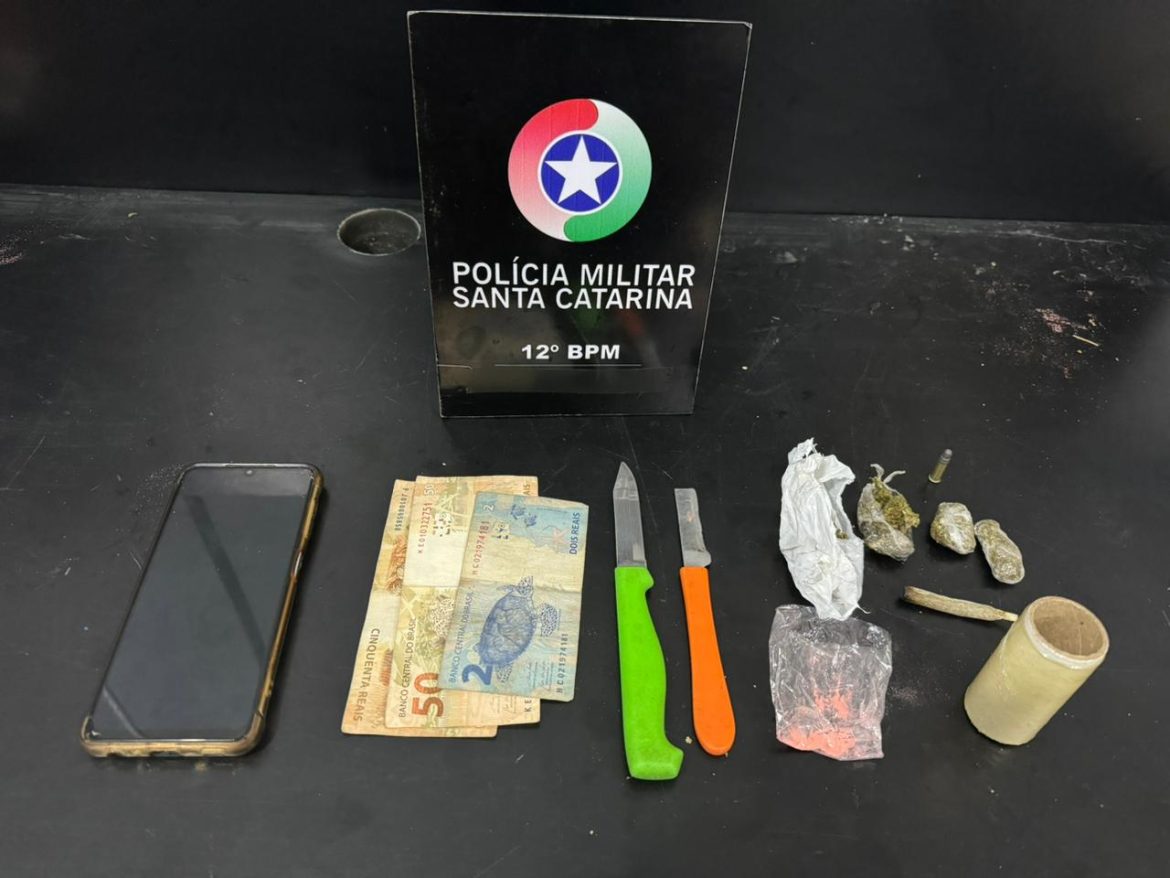 Já em sua residência, localizada na rua Mercendario, bairro Monte Alegre, em Camboriú, foi encontrado maconha e MDMA, utensílios para fracionamento e embalagem de drogas, além de uma munição calibre .22.