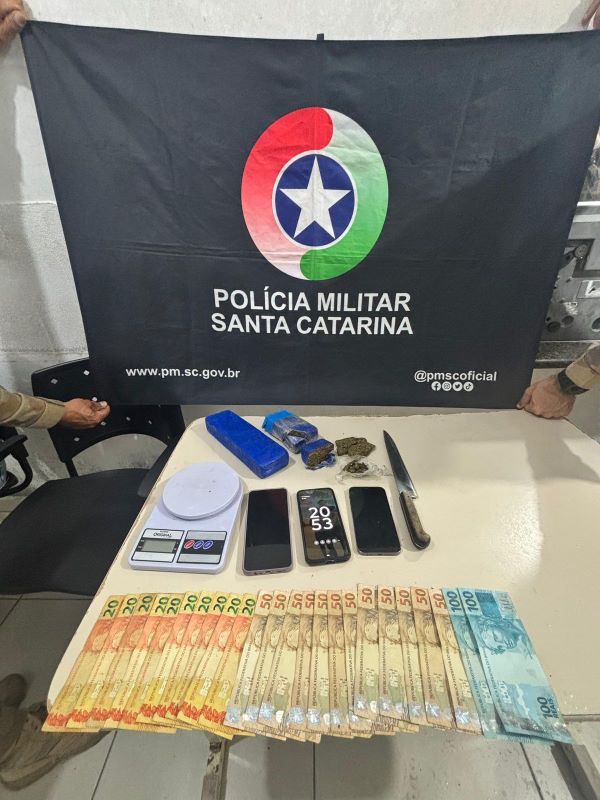 A Polícia Militar flagrou uma ocorrência de tráfico de drogas e associação para o tráfico na noite desta terça-feira (13), por volta das 20h30, na Rua 450, área conhecida como de invasão, no bairro Jardim Praia Mar, em Itapema.
