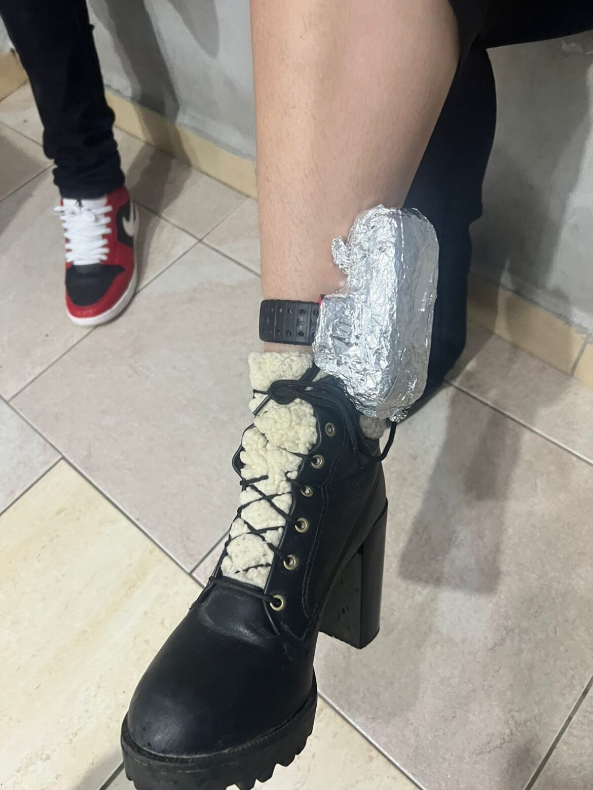 Ainda, a mesma, estava com uma tornozeleira eletrônica envolta com papel alumínio, visando dificultar o funcionamento do equipamento.