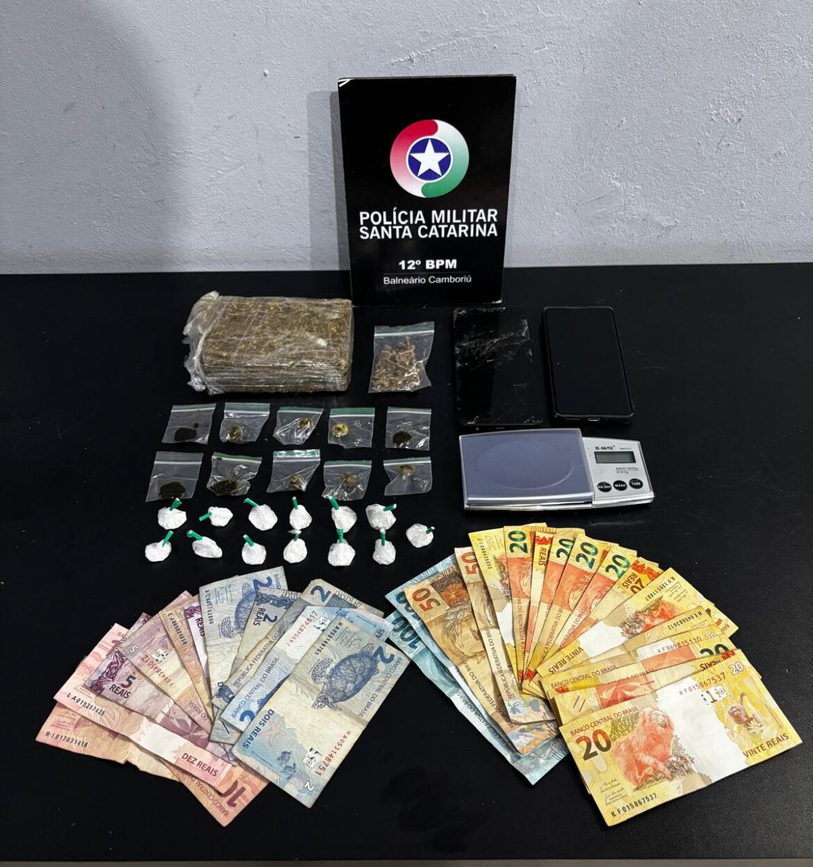Com base em informações da Agência de Inteligência do 12ºBPM, após abordagem em um restaurante, foram localizados 13 buchas de cocaína, 10 buchas de haxixe, 430g de maconha e balança de precisão.