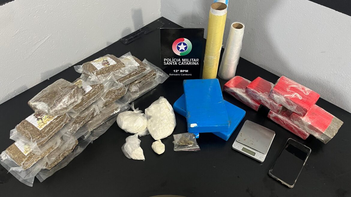 Na madrugada deste sábado, 27, após monitoramento, o suspeito foi visualizado na rua Síria, em Balneário Camboriú, sendo abordado. Em um imóvel, localizado na rua Agrolandia, foram encontrados 3,100 Kg Skunk, 2,500 kg de Cocaína, 1,900 kg de maconha, 01 balança de precisão e 03 rolos plásticos para embalagens das drogas.