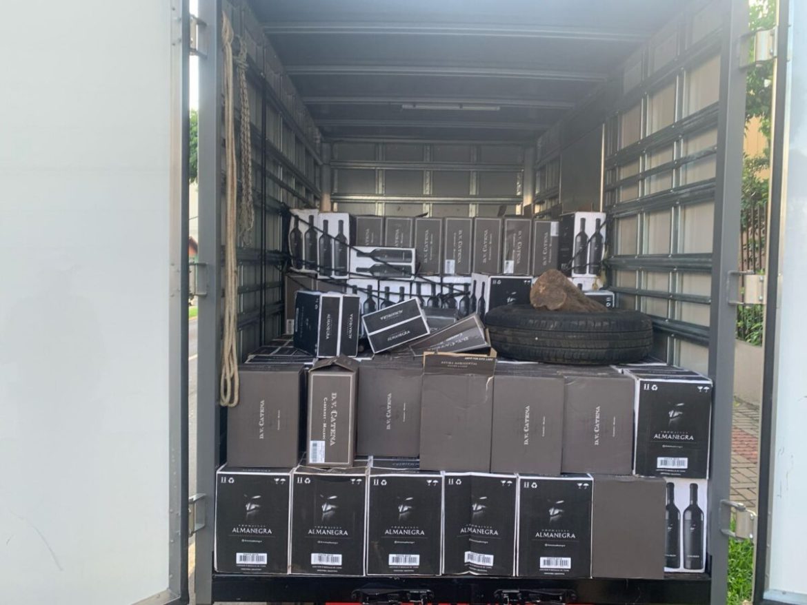 O condutor relatou ter aproximadamente 2.160 garrafas da marca D.V.CATENA e ALMANEGRA, que seriam entregues em Porto Alegre.