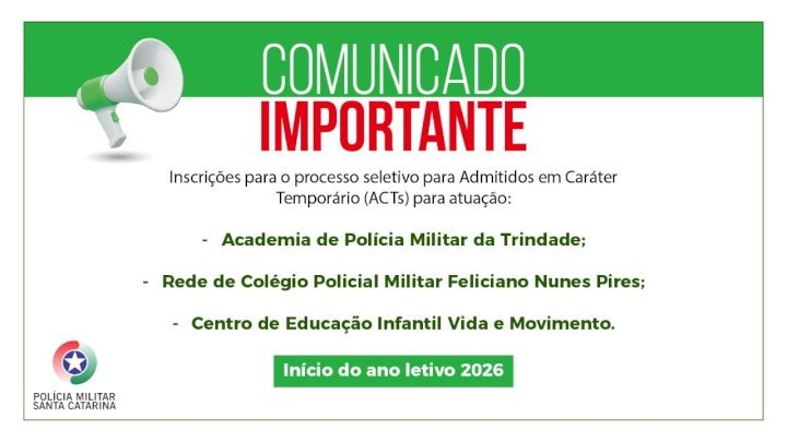 A Polícia Militar de Santa Catarina (PMSC) abriu as inscrições do processo seletivo, a serem admitidos em caráter temporário (ACT), de profissionais para a Academia de Polícia Militar da Trindade (APMT) em Florianópolis, para a Rede de Colégio Policial Militar Feliciano Nunes Pires (CFNP) nas unidades de Florianópolis, Lages, Blumenau, Joinville, Laguna, Jaraguá do Sul e Chapecó, e para o Centro de Educação Infantil Vida e Movimento (CEIVM) em Florianópolis, para ano letivo 2026.