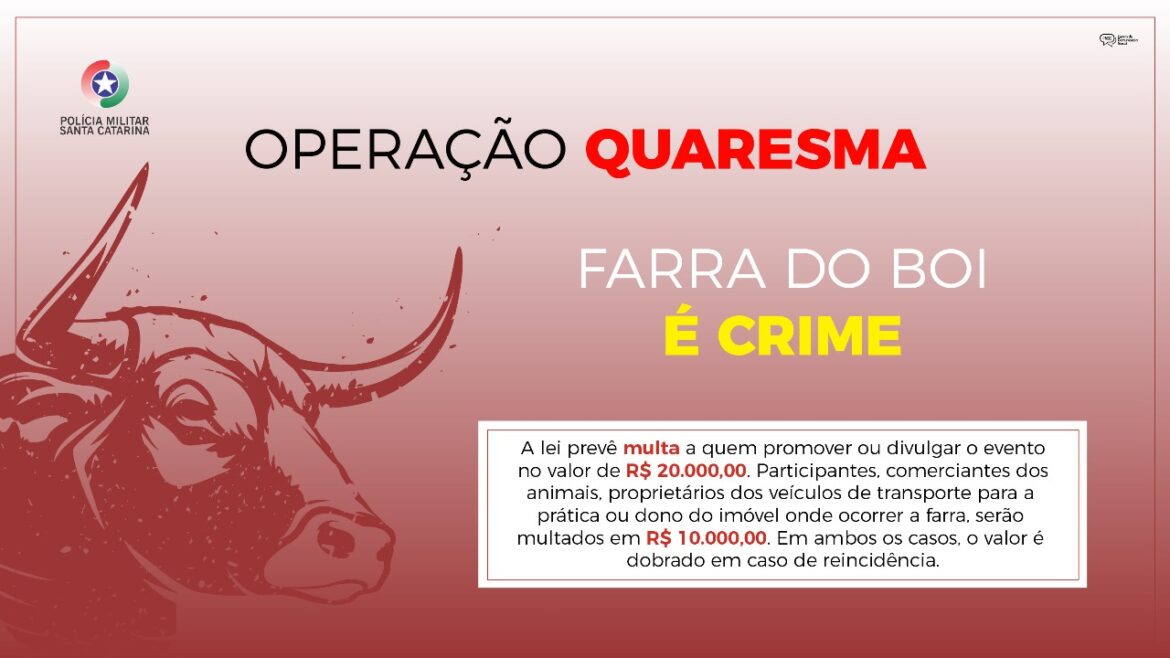 A Polícia Militar de Santa Catarina (PMSC) informa que iniciou os trabalhos da Operação Quaresma, que será realizada até o dia 20 de abril. Com o apoio de órgãos da vigilância sanitária e da Companhia Integrada de Desenvolvimento Agrícola de Santa Catarina (Cidasc), os trabalhos têm o objetivo de agir de forma preventiva, evitando que a ocorrência de Farra do Boi chegue a acontecer, contribuindo para a proteção dos animais e a promoção do respeito à vida.