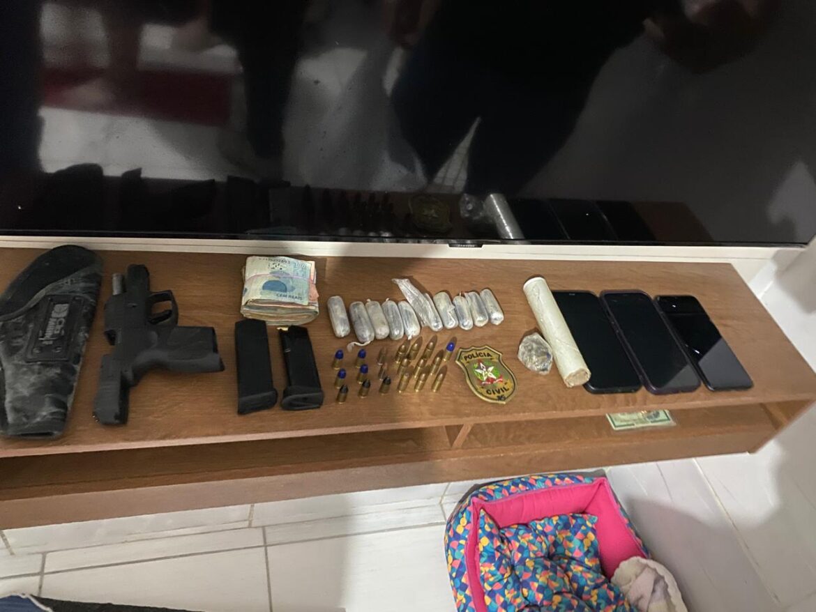 Na residência do suspeito, situada no bairro Nova Esperança, foram apreendidas porções de maconha, cocaína e uma arma de fogo de calibre de uso restrito.