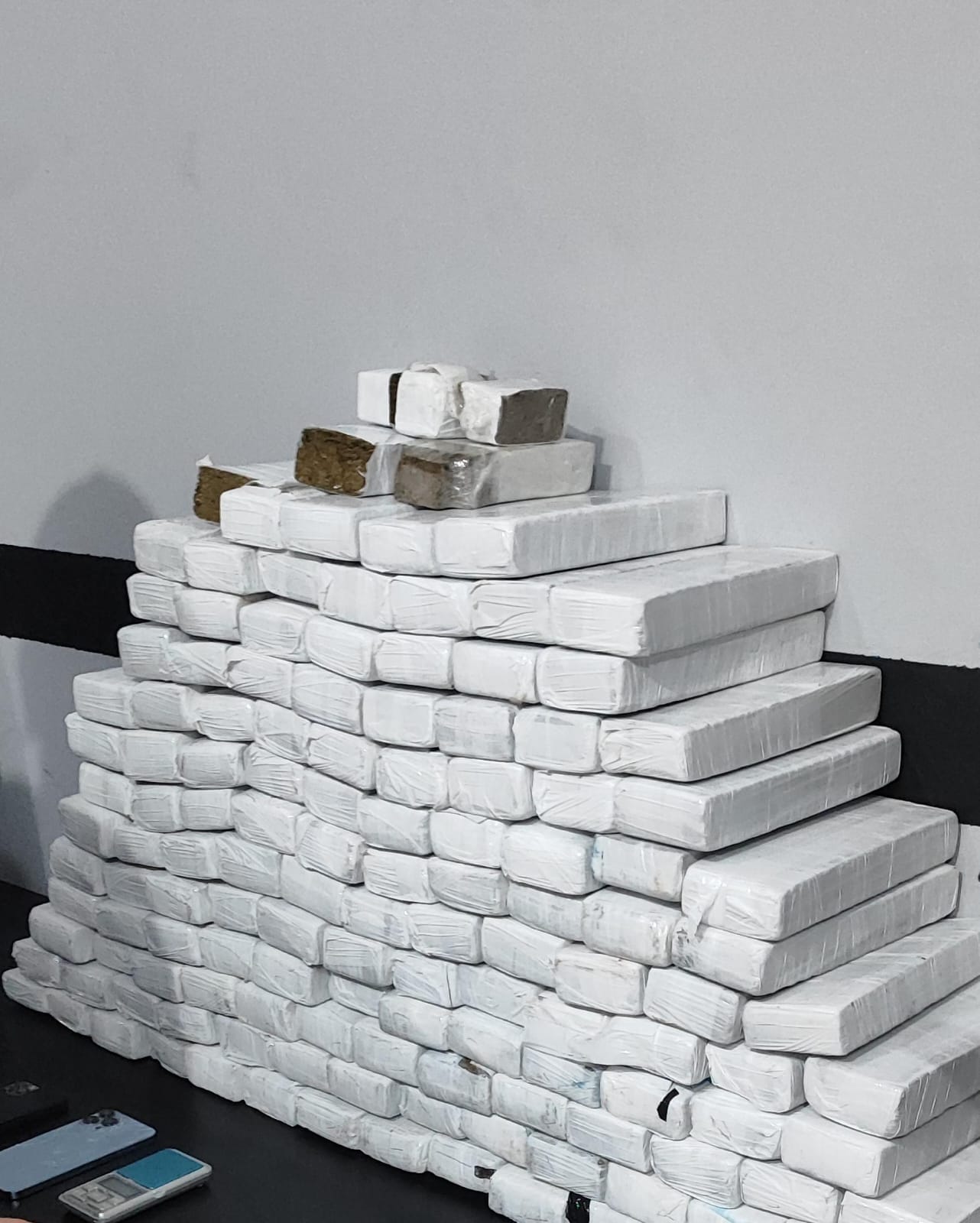 No imóvel monitorado, os policiais localizaram outro suspeito, de 32 anos, além de mais um tablete da droga. Em uma casa vizinha, usada como depósito, foi preso um homem de 26 anos, responsável por armazenar outros 66,2 quilos de entorpecente.